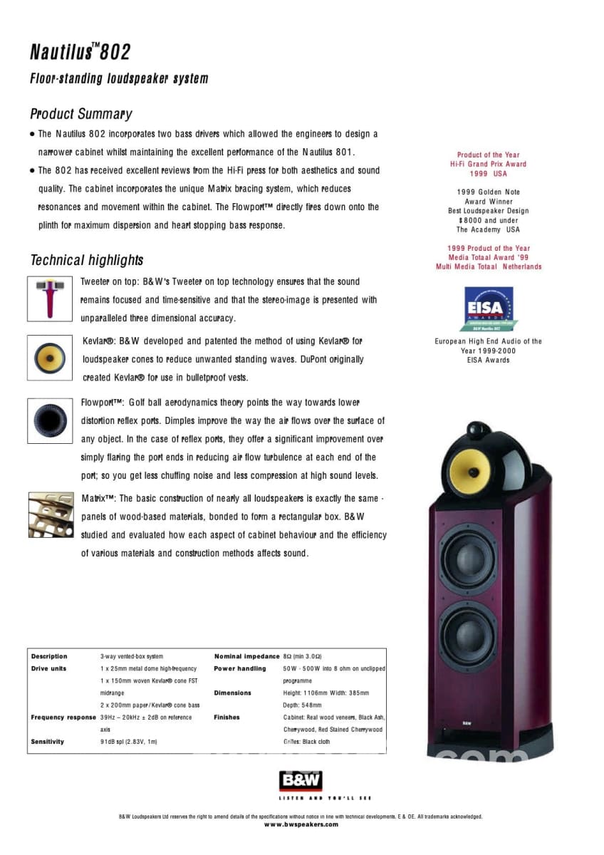 • The 802 has received excellent reviews from the Hi-Fi press for both aesthetics and sound quality. The cabinet incorporates the unique Matrix bracing system, which reduces resonances and movement within the cabinet. The FlowportTM directly fires down onto the plinth for maximum dispersion and heart stopping bass response.