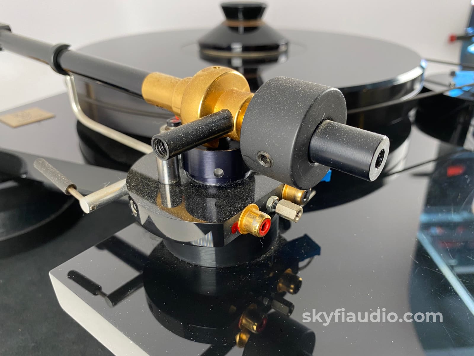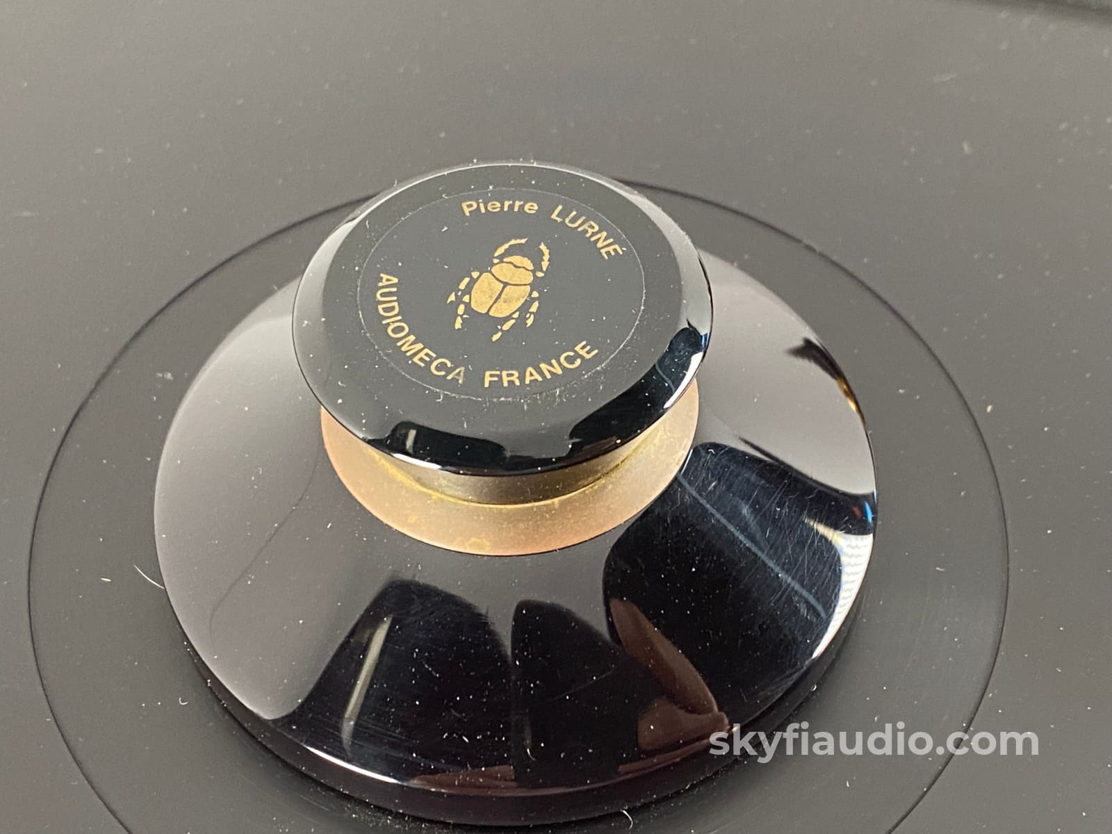 Now the arm. This is a unipivot and is designed using Lurne's purist approach based on the idea of a 'perfect mass', a concept he's championed for over 30 years. This I will skim over for the moment as Pierre Lurne has promised an interview on this, but by having the centre of gravity only just below (and a little ahead to give downforce) the stylus/pivot axis and a straight arm with mass arranged symmetrically around it, the result is that the arm requires the same force to deflect it in any direction. With a low centre of gravity such as with the Kuzma or Hadcock (and many other) arms, when the arm has to rise to clear a warp the centre of gravity must be raised through a much greater arc, thus increasing tracking force at the worse possible moment, it also acts as a pendulum with its own resonance. Likewise with such a 'perfect mass' the arm can be deflected left and right with equal force - important with eccentric records (all of them). In fact in philosophy it's as far from the Kuzma as it is possible to get with a unipivot..