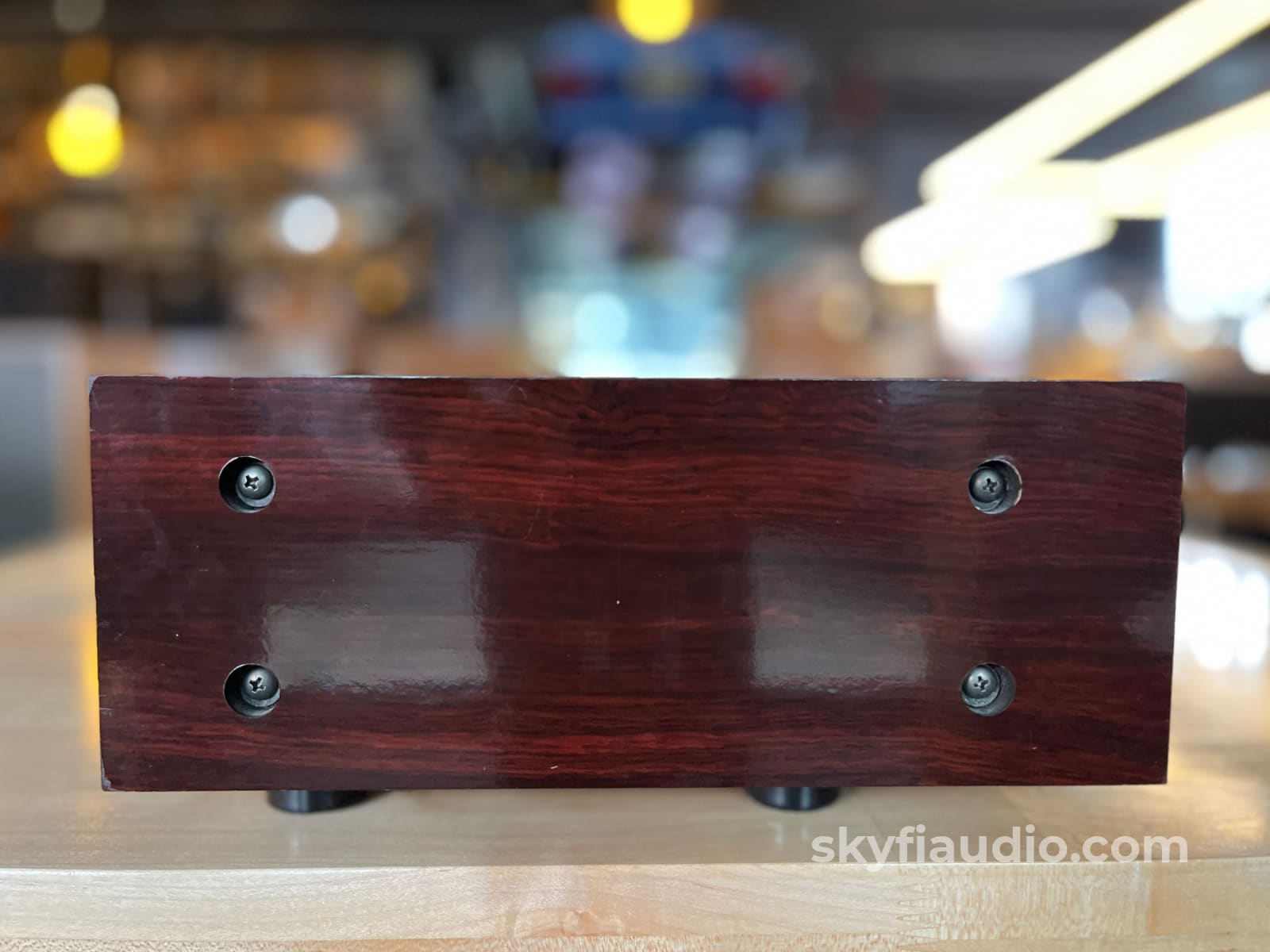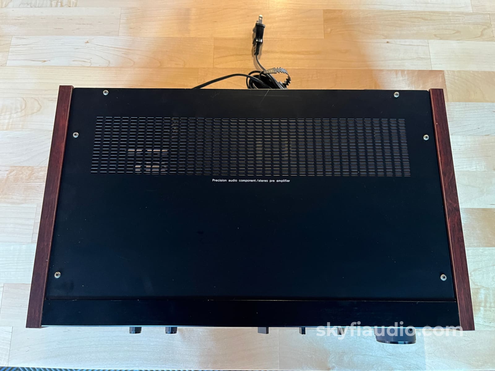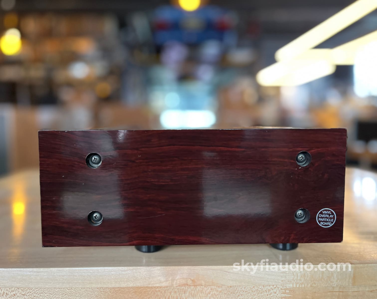 This sleek and very well built Denon preamplifier is a great choice for matching with 1980's or 1990's gear. This particular PRA-1000 also still has its matching rosewood veneered side panels that really complete the vintage look.