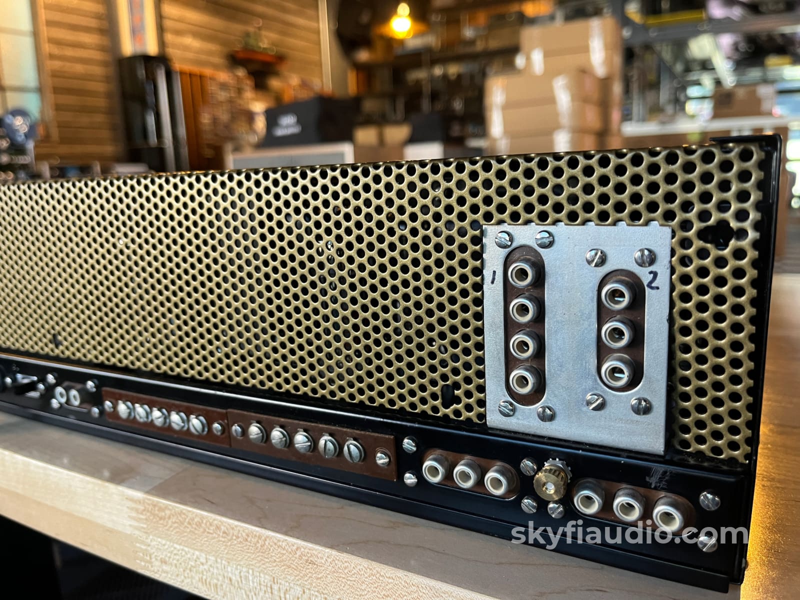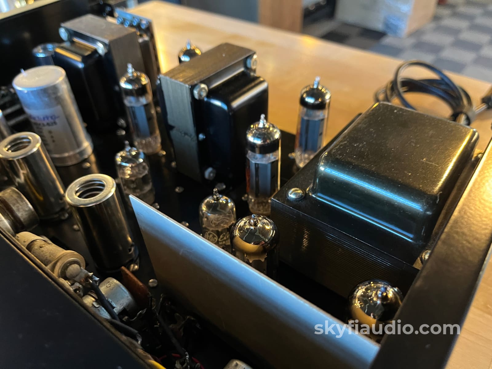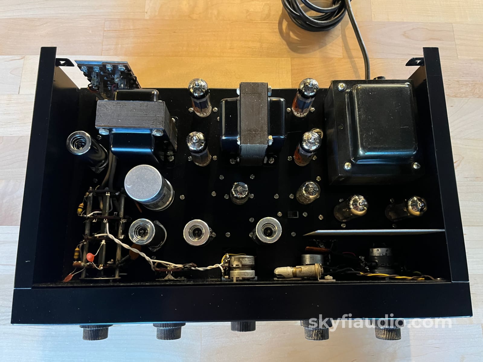 This unit was fully recapped including a new CE multi-section can, axial electrolytics, a mix of film and PIO coupling caps, and select mica capacitors. Select resistors replaced, modern three prong power cord added, SEP/COM Switch removed from circuit, a power switch was added to the rear panel, and a phono grounding lug was installed.