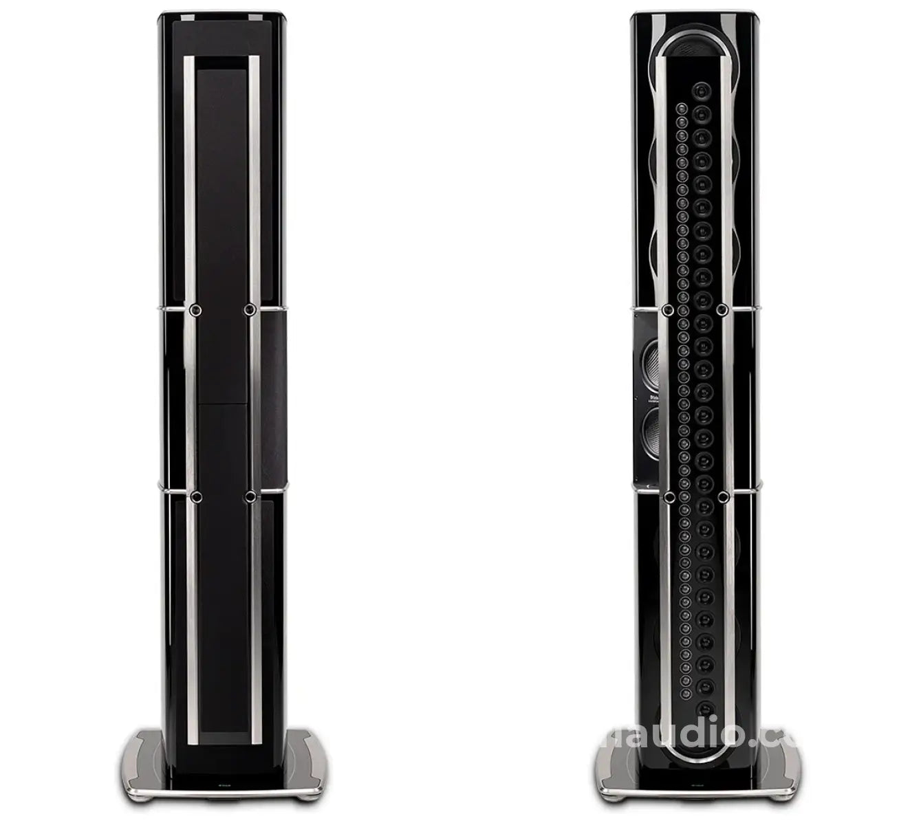 Visually, the XRT2.1K is as striking as it sounds. The reinforced bass cabinet is a combination of brushed and black aluminum and is finished with 7 layers of high gloss piano black paint. The line array mimics the timeless McIntosh front panel appearance with a glossy black center section and 2 silver aluminum end caps. It is suspended from the front of the bass cabinet via steel spiders that are capped with magnetically attached covers that look like a McIntosh control knob. The removable speaker grilles are attached via magnets and feature black knit cloth with high gloss trim. The cabinet pedestal is made of machined aluminum and glass; it is supported by 4 adjustable feet that allow the speaker to make perfect contact with your floor, thus eliminating a possible source of distortion or vibration.