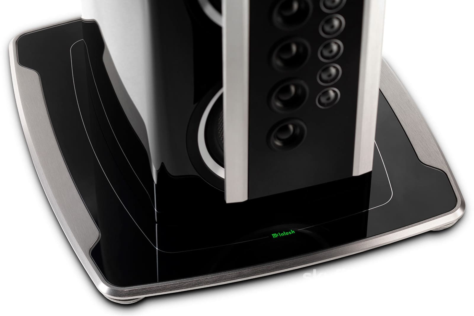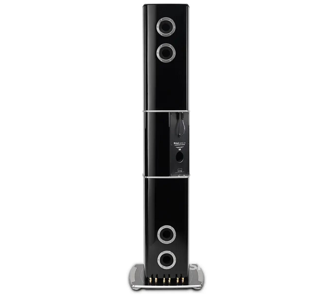 Our patented, gold-plated Solid Cinch speaker binding posts easily but securely attach your speaker cables to prevent them from coming loose while also ensuring a quality signal is delivered to your loudspeaker. Separate pairs of binding posts are available for the mid/high, low and subwoofer frequencies to allow for tri-amping or tri-wiring. The McIntosh logo on the front of the base plate can be illuminated green with the use of our Power Control technology found in our amplifiers, preamplifiers, integrated amplifiers and other products. Contact your local dealer to learn more.