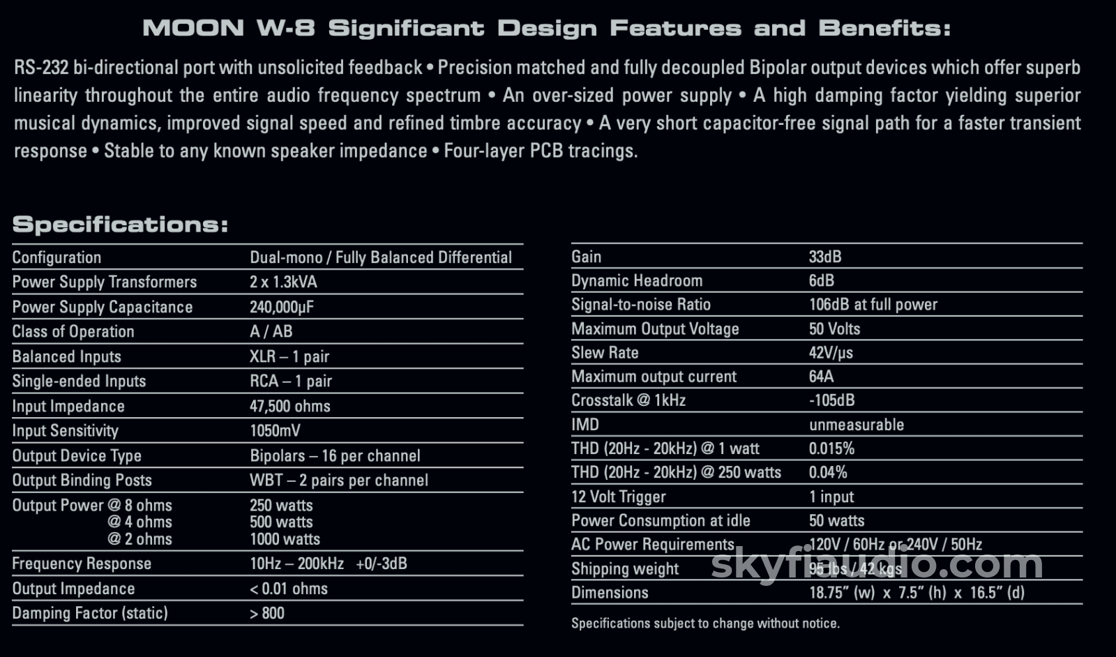 This listing is for the W-8 amplifier with the original Simaudio bottom feet, and a power cord.