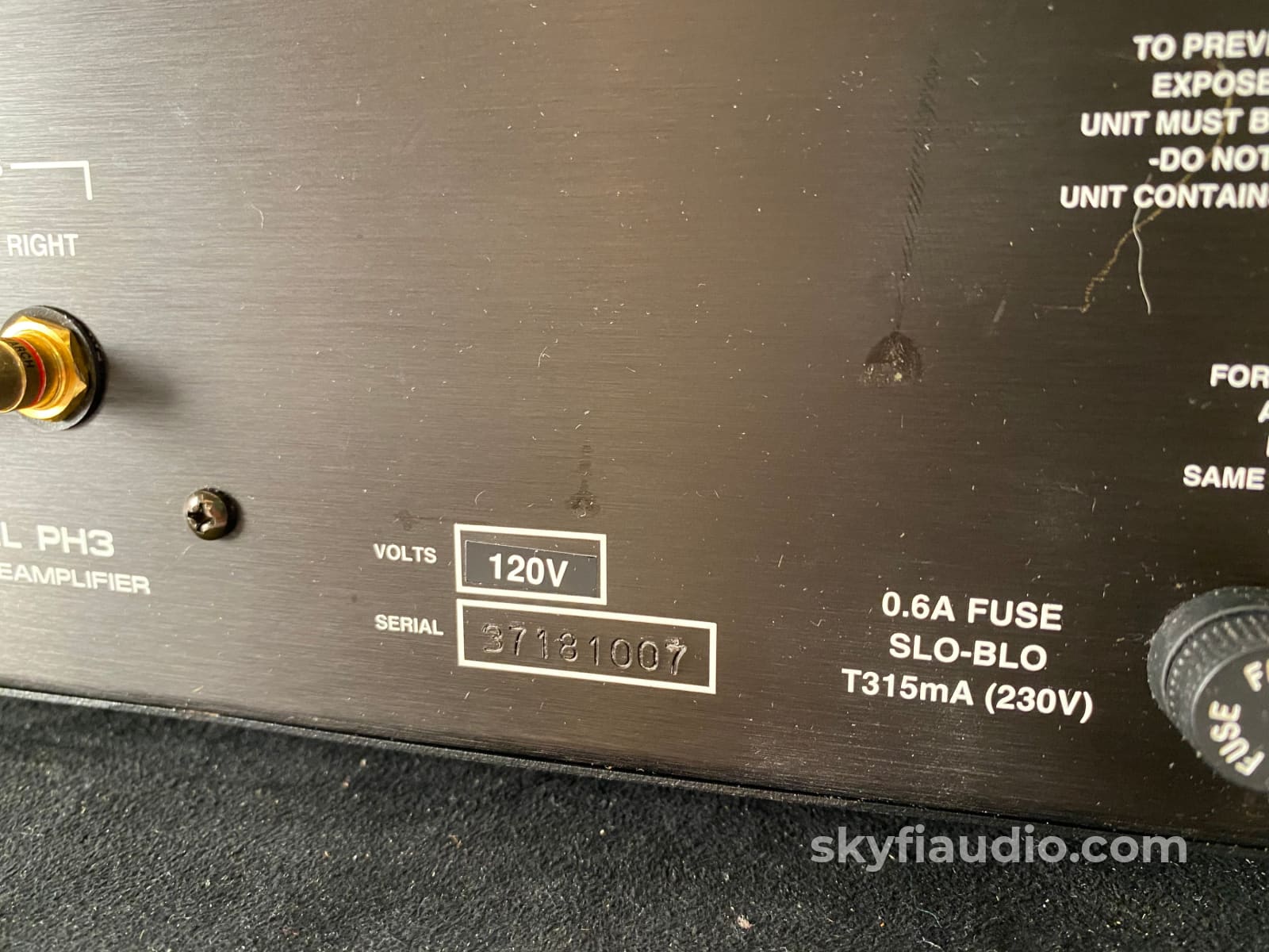 The PH3 is a phono preamplification stage intended for use with an active line-level stereo preamplifier. Fully single-ended from input to output, the PH3 uses a combination of J-FET input stage technology (for low inherent circuit noise) and class A operation vacuum-tube gain via three 6922 twin triodes. Total gain of the PH3 is 54 dB (non-adjustable). Used with typical line preamplifiers having 12 to 18 dB of gain, the PH3 is suitable for phono cartridges having .25 mV output or higher. Input impedance is factory-set at 47K ohms, and input capacitance at 90 pF. For optimal matching to moving-coil and moving-magnet phono cartridges, both input impedance and input capacitance may be adjusted via simple resistor and capacitor changes.