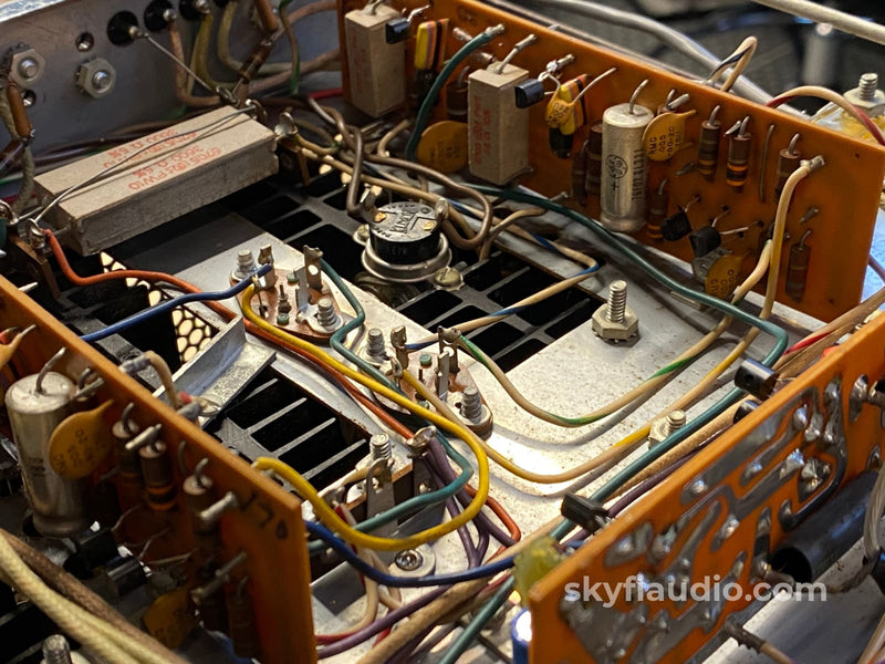 We start with a visual inspection of all internal components to make sure there are no signs of stress or aging. Capacitors are checked for telltale sings of bulging or leaking, resistors are checked for signs of overheating or cracking, and transistors are checked for signs of stress or damage.