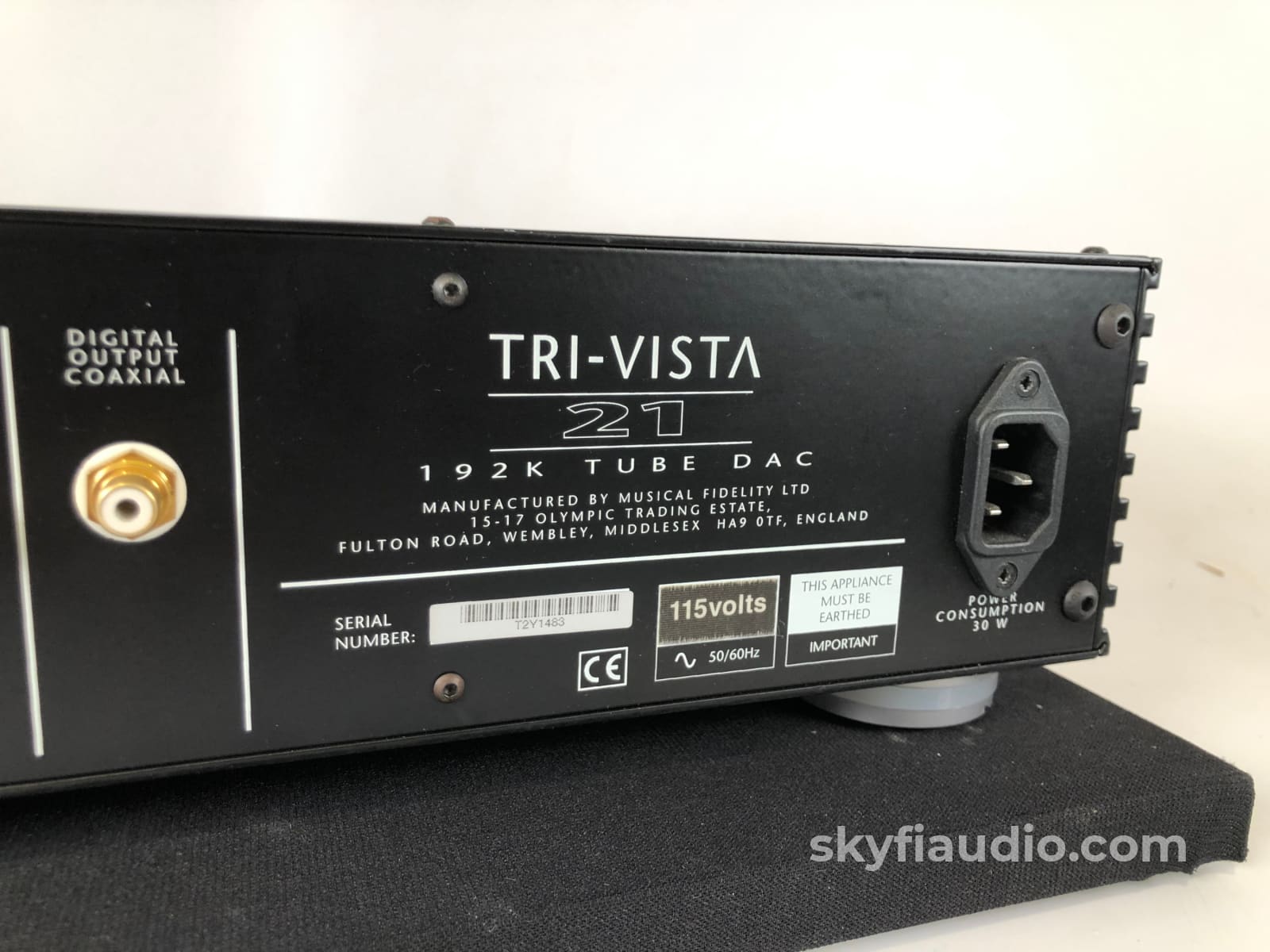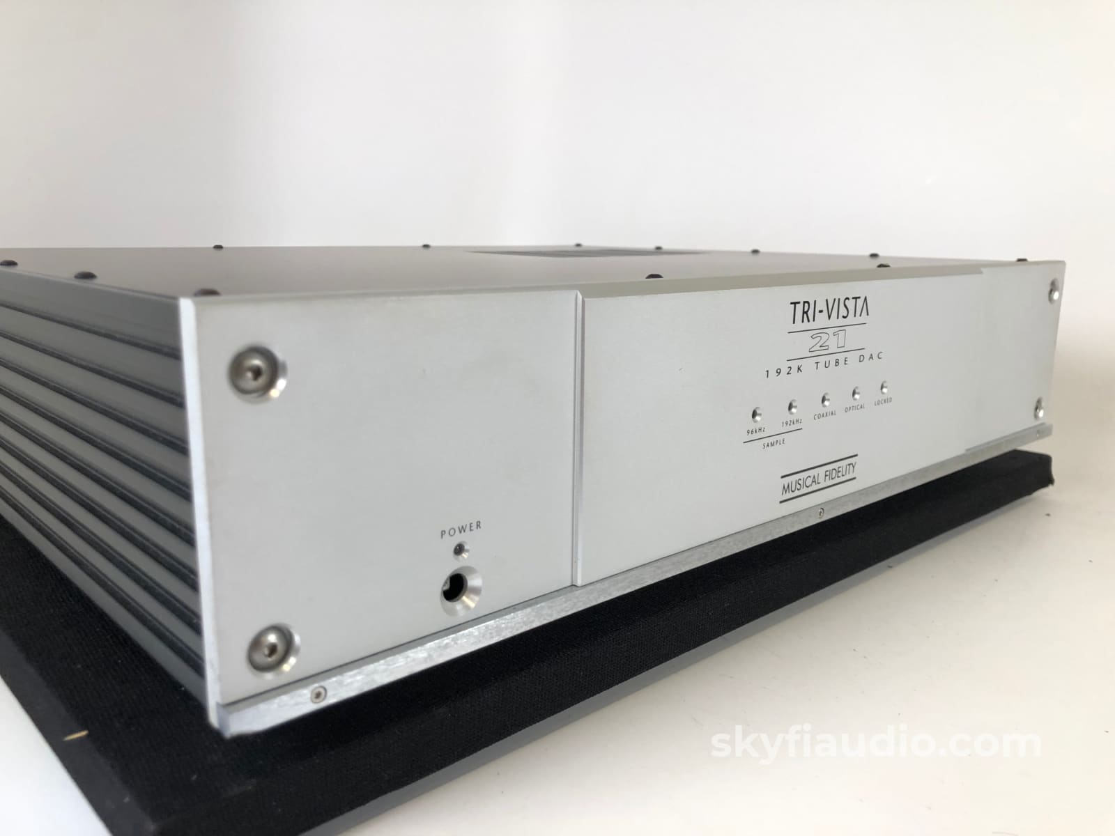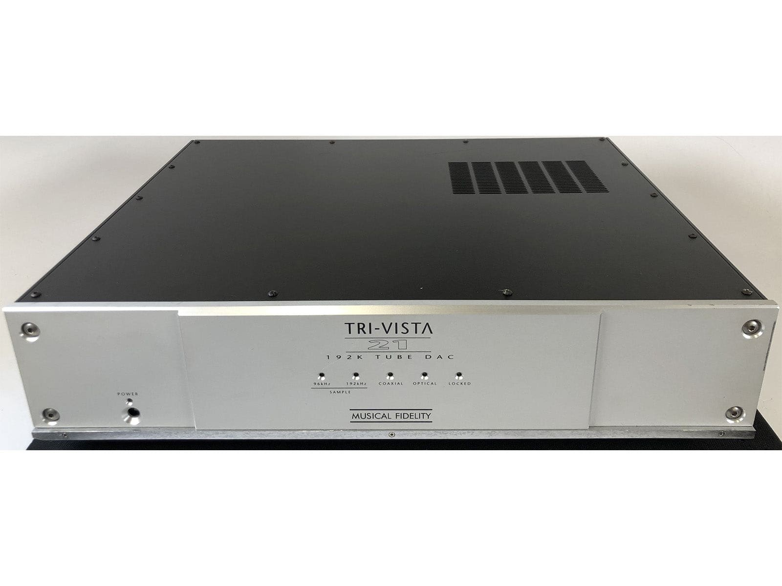 The Tri-Vista 21 was a limited edition DAC sold in late 2004, early 2005. It was massively overbuilt - great power supply and output stage, and ran extremely long life 5703 milspec tubes, which are good for 100,000 hours. The unit is hefty, 20 lbs, and it has toslink and SPDIF inputs, and RCA outputs. The power supply is heavily regulated and has great chokes - Musical Fidelity built this unit to a spectacular degree. The feet of the unit feature LEDs that light up first orange then blue to signal when the unit has reached ideal warmup.