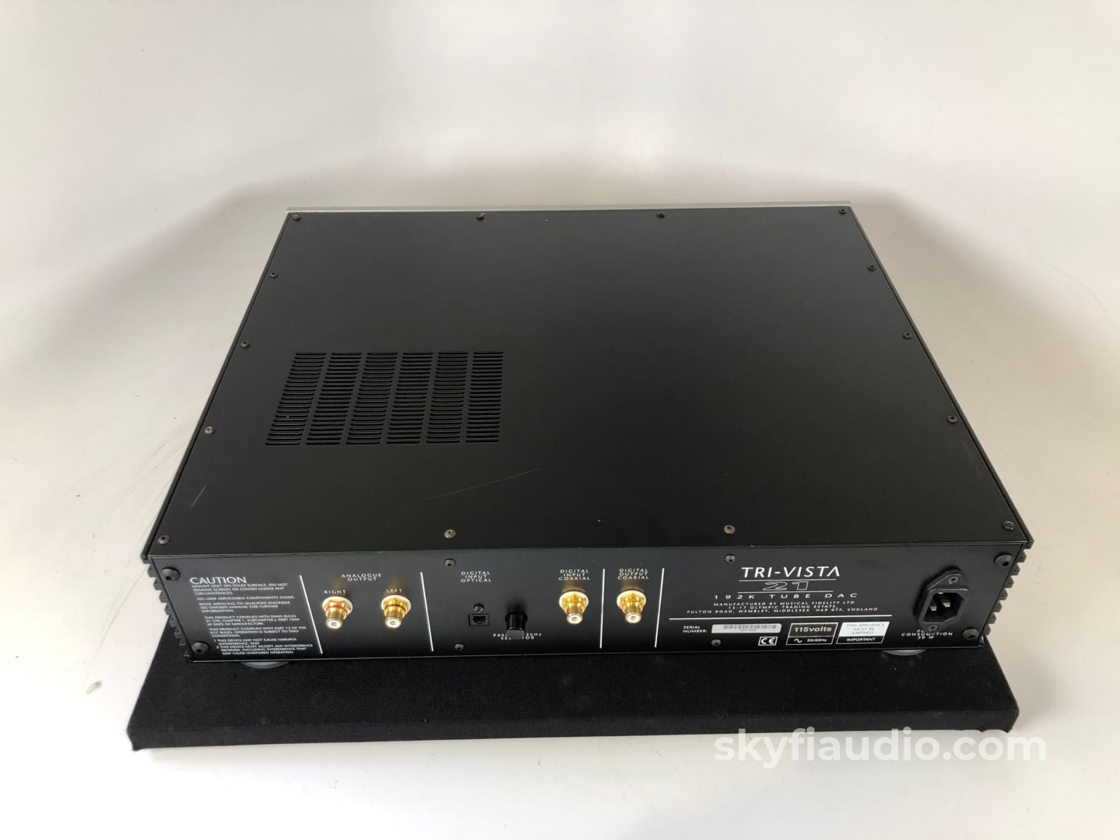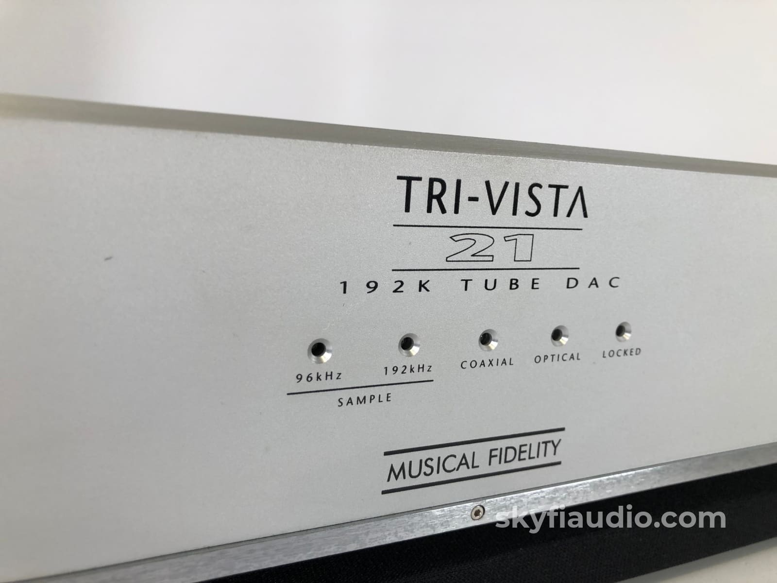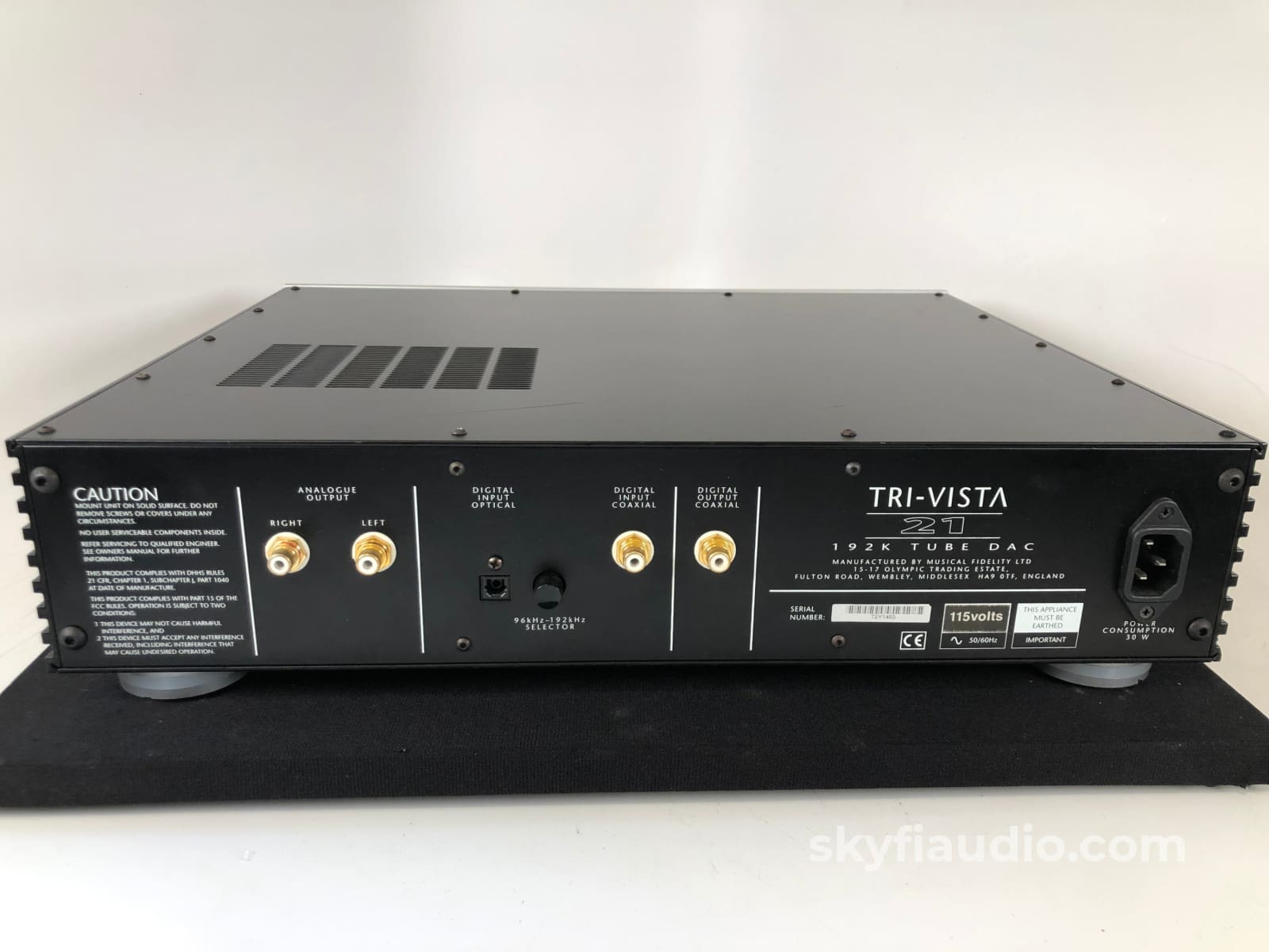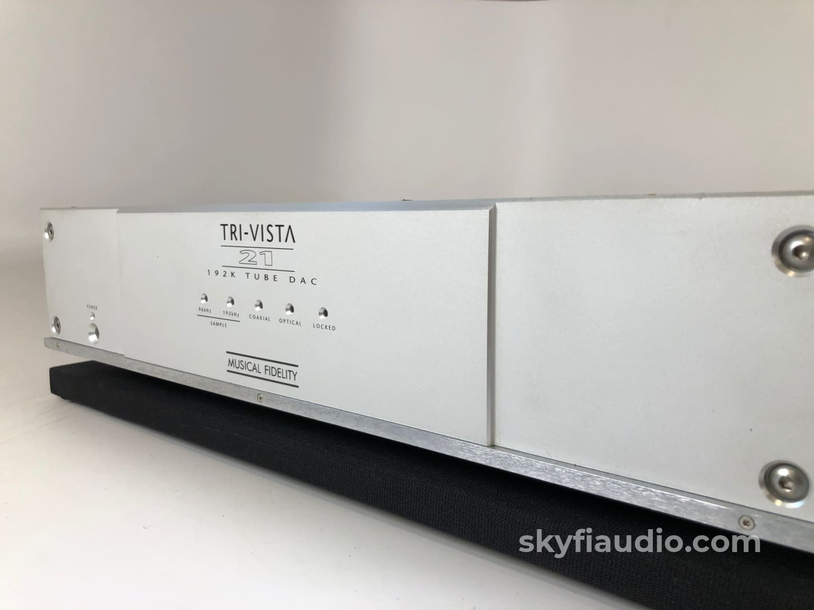 The Tri-Vista 21 was a limited edition DAC sold in late 2004, early 2005. It was massively overbuilt - great power supply and output stage, and ran extremely long life 5703 milspec tubes, which are good for 100,000 hours. The unit is hefty, 20 lbs, and it has toslink and SPDIF inputs, and RCA outputs. The power supply is heavily regulated and has great chokes - Musical Fidelity built this unit to a spectacular degree. The feet of the unit feature LEDs that light up first orange then blue to signal when the unit has reached ideal warmup.