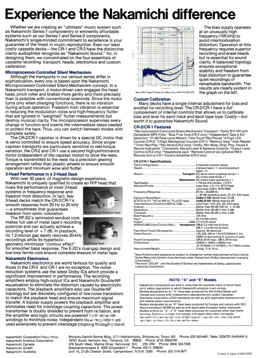 The CR-1 cassette deck incorporates many aspects of the sophisticated technology developed for Nakamichi's upper range models. In a simple and compact package, this deck delivers sound quality that rivals many of its peers.