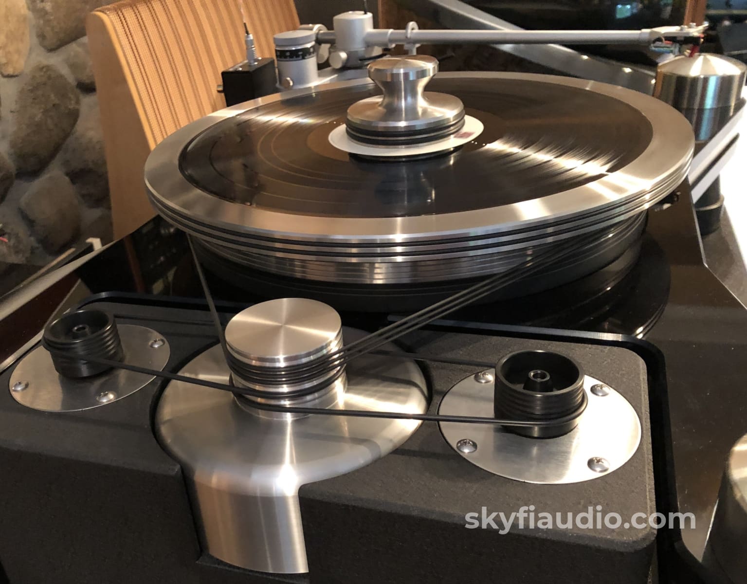 - 40-pound separate machined drive system uses two low-powered 24-pole 300RPM AC synchronous motors driving a 12-pound flywheel. The drive unit is machined from a solid block of aluminum, its accuracy assured by using only one piece, giving the lowest-possible wow and flutter from a belt drive.