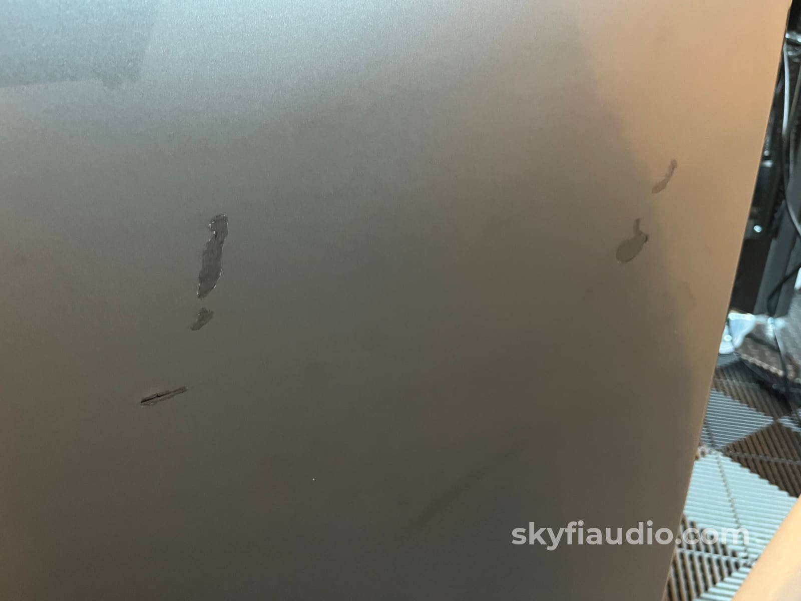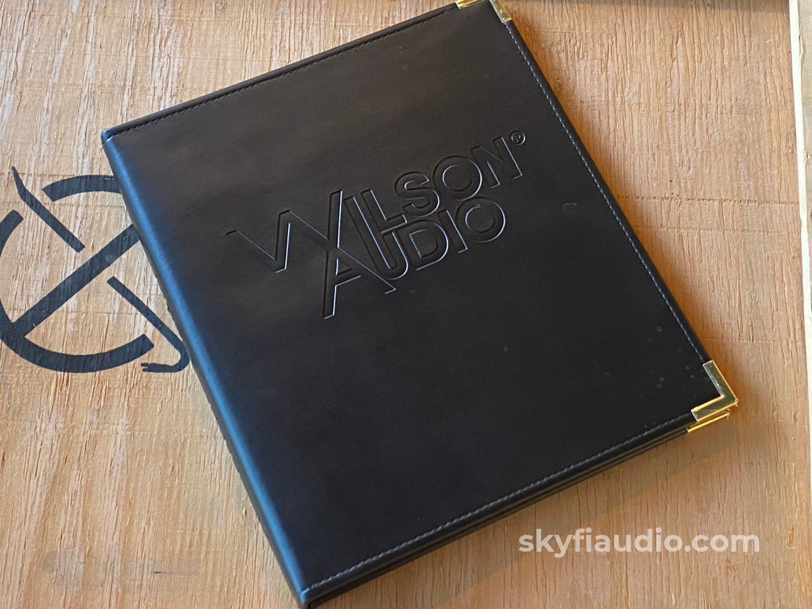 The side of one bottom cabinet has two large chips. They have been touched with the official Wilson supplied color. Otherwise the rest of the speakers look excellent. All drivers are intact, grills are clean.